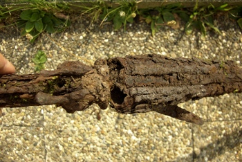Ein Zünder, fast komplett, Innenleben fehlt halt. Das Teil steckte in einem Baumstumpf. Länge 40mm, Gewicht 71g. |