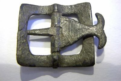 | Eine Messingschnalle. Fundort ca. 200m nordwest von der oberen Burg auf einem alten Zugangsweg 20cm im Waldboden. Maße: 30mm x 25mm x 1mm. Gewicht: 9g | ||